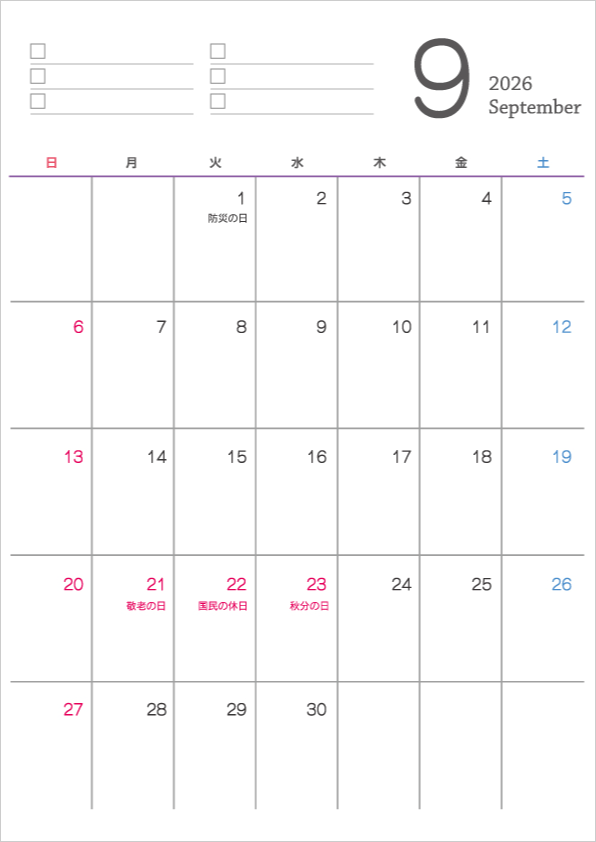 月曜始まりの2026年(令和8年)6月のカレンダー・印刷用